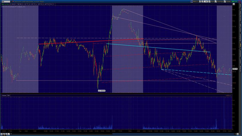 Extending the channel bottom vector from this coming Monday's '3 weeks ago' backdate (when the last sustained short-term three day rally started) through today's timeframe will yield an 'end day price equivalency low' (EDPEL) on the DIA for today at about $111.30.